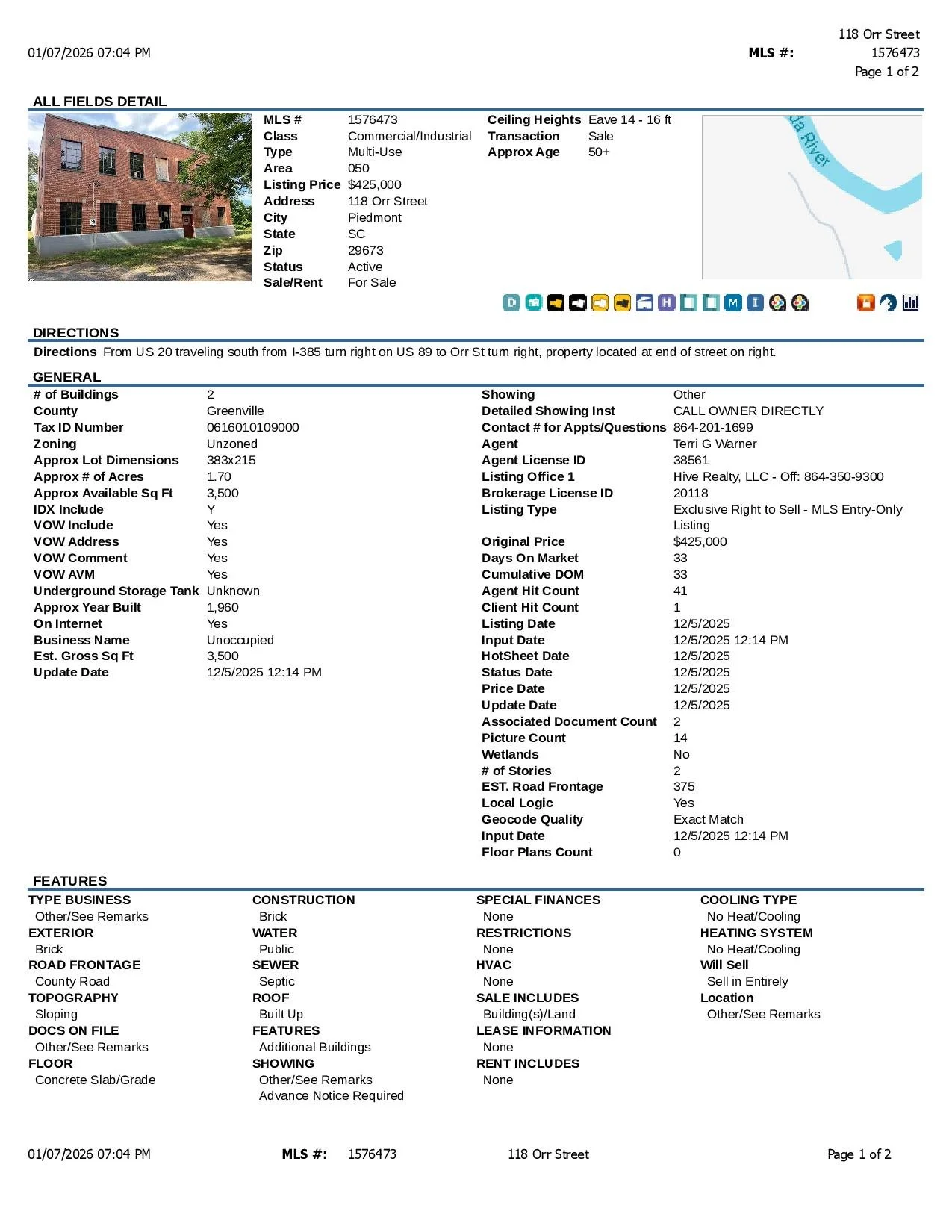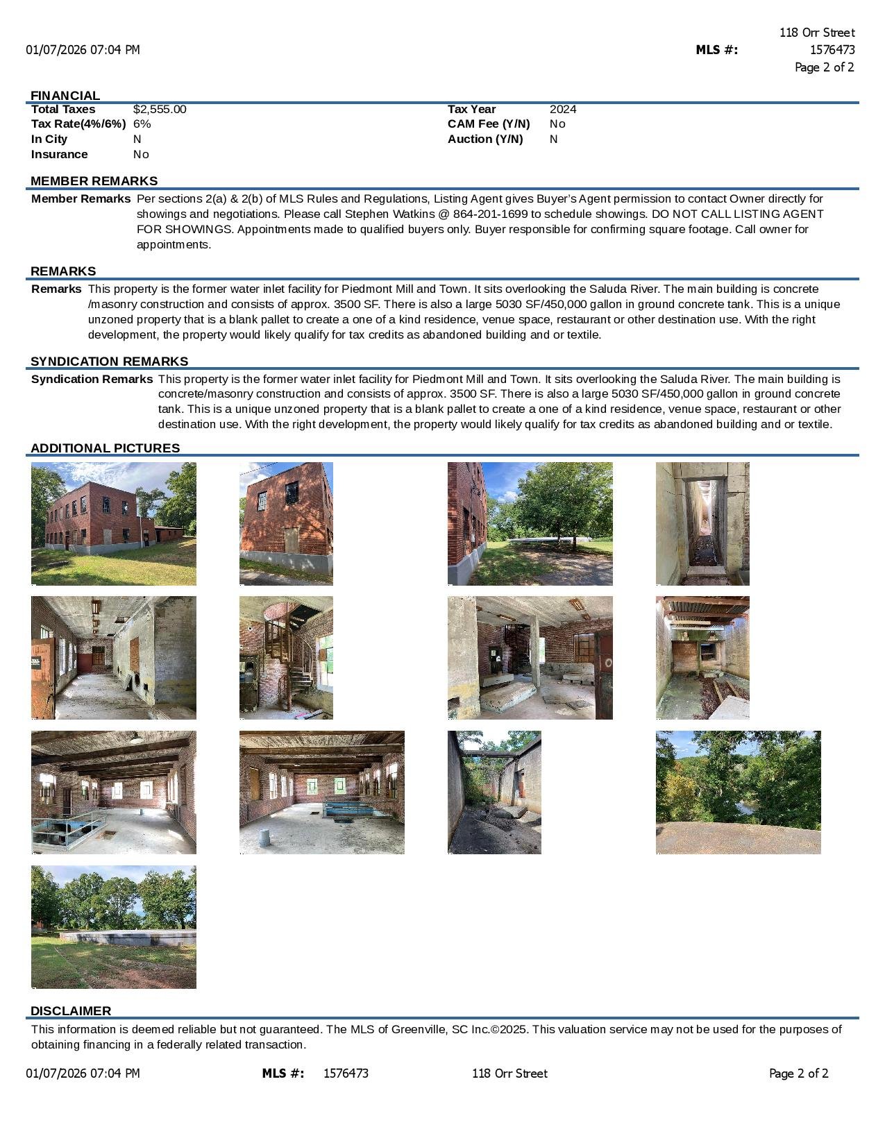 This property is the former water inlet facility for Piedmont Mill and Town. It sits overlooking the Saluda River. The main building is concrete/masonry construction and consists of approx. 3500 SF. There is also a large 5030 SF/450,000 gallon in ground concrete tank. This is a unique unzoned property that is a blank pallet to create a one of a kind residence, venue space, restaurant or other destination use. With the right development, the property would likely qualify for tax credits as abandoned building and or textile.