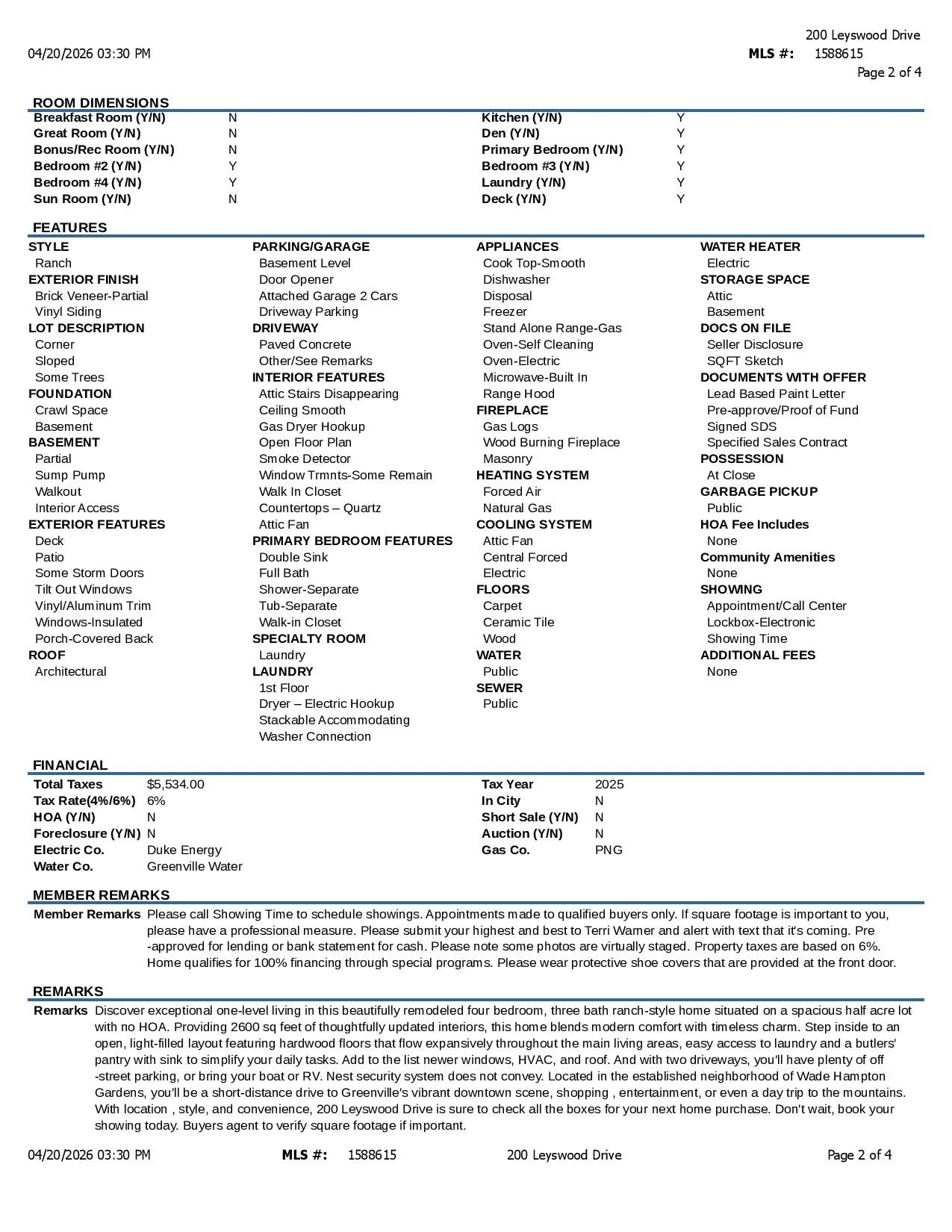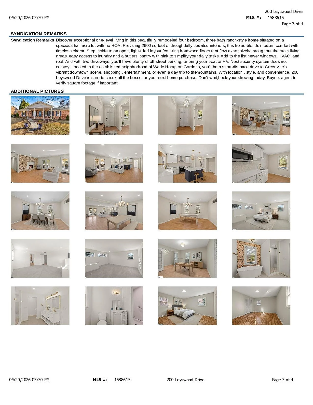 Discover exceptional one-level living in this beautifully remodeled four bedroom, three bath ranch-style home situated on a spacious half acre lot with no HOA. Providing 2600 sq feet of thoughtfully updated interiors, this home blends modern comfort with timeless charm. Step inside to an open, light-filled layout featuring hardwood floors that flow expansively throughout the main living areas, easy access to laundry and a butlers' pantry with sink to simplify your daily tasks. Add to the list newer windows, HVAC, and roof. And with two driveways, you'll have plenty of off-street parking, or bring your boat or RV. Nest security system does not convey. Located in the established neighborhood of Wade Hampton Gardens, you'll be a short-distance drive to Greenville's vibrant downtown scene, shopping , entertainment, or even a day trip to the mountains. With location , style, and convenience, 200 Leyswood Drive is sure to check all the boxes for your next home purchase. Don't wait, book your showing today. Buyers agent to verify square footage if important.